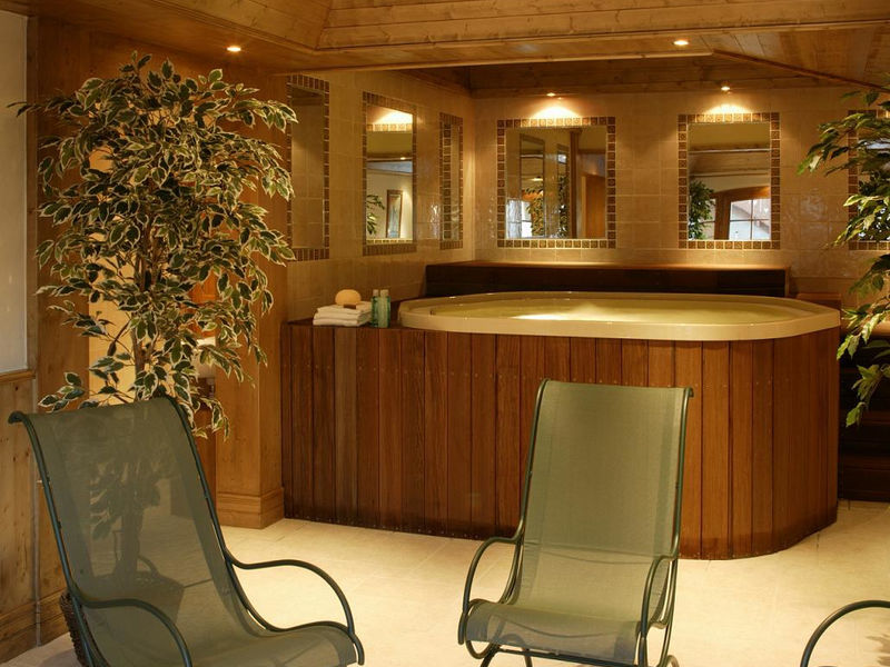 Chalet 8 (95 m²) se saunou - obývací pokoj, salonek s krbem, sedací souprava, křeslo a TV s plochou obrazovkou, jídelní kout, čtyři ložnice: jedna s manželskou postelí a tři se dvěma samostatnými lůžky, dvě koupelny (s vanou nebo sprchou) a dva sprchové kouty, 3x WC, privátní sauna