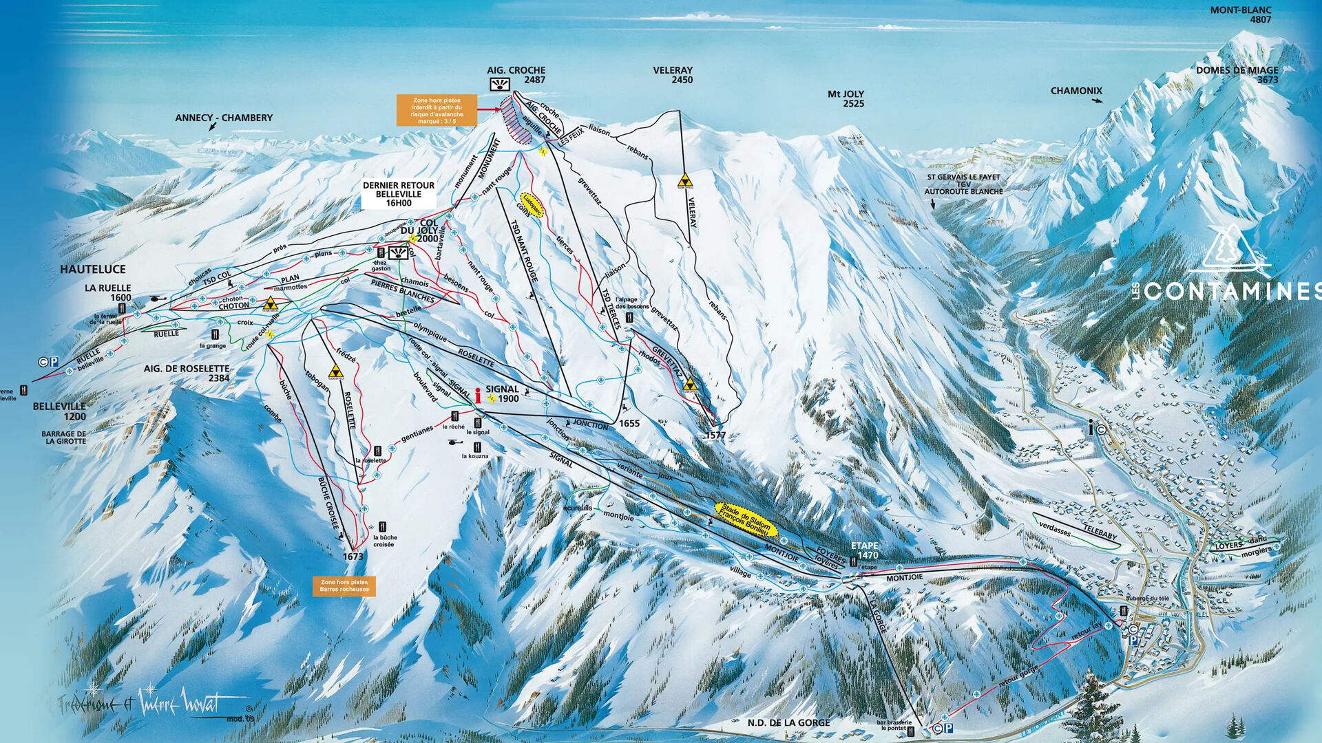 Les Contamines Montjoie je součástí rozsáhlého lyžařského areálu Evasion Mont-Blanc, a nabízí tak společně s destinacemi St. Gervais, Megève, Combloux a La Giettaz celkem 183 sjezdovek na 445 kilometrech sjezdových tratí a 87 vleků.