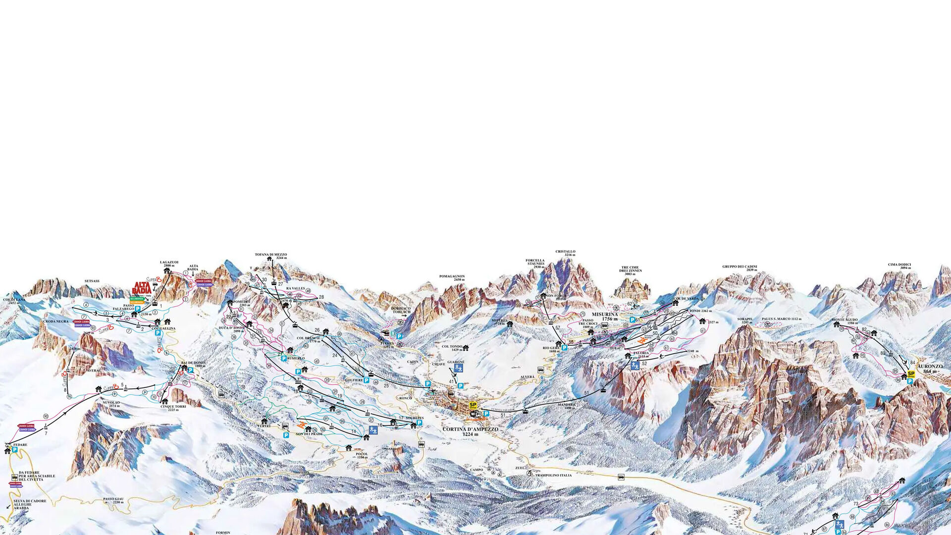 Cortina d'Ampezzo je součástí lyžařského sdružení Dolomiti Superski. Dvanáct lyžařských středisek v Dolomitech se zde spojilo a dohromady nabízejí přes 450 vleků a 1 200 kilometrů sjezdovek. S lyžařskou permanentkou Dolomiti Superski si můžete užít lyžování nejen v Cortině, ale také například v Kronplatz, Alta Badia a Gröden.