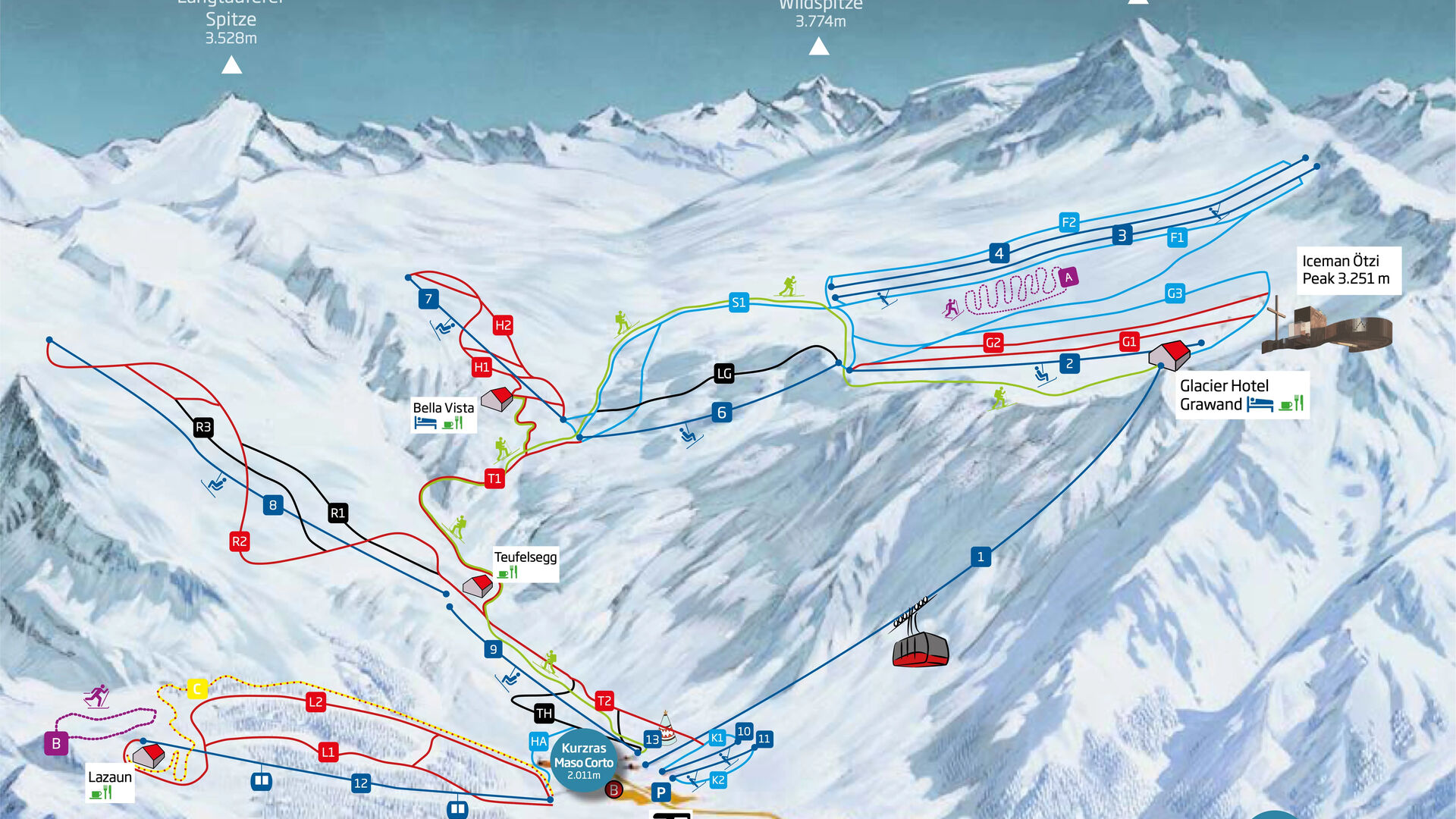 Sjezdy na ledovci Schnalstal začínají na horní stanici lanovky Grawand ve výšce 3 212 metrů a vedou až do dolní stanice v Kurzrasu, která se nachází v nadmořské výšce přes 2 000 metrů. Lyžaři, kteří mají rádi náročné sjezdovky, se mohou těšit na tratě, jako je osmikilometrový sjezd do údolí přes Schmugglerscharte nebo sjezd Teufelsegg. Ale i pro začátečníky a lyžaře, kteří si chtějí užívat, je zde mnoho možností. Navíc se zde nabízí fantastické panoramatické výhledy na Ötztalské Alpy a možnost stravovat se na nejvýše položeném hotelu v Evropě, který se nachází ve výšce 3 212 metrů, na panoramatické terase a užívat si působivý výhled.