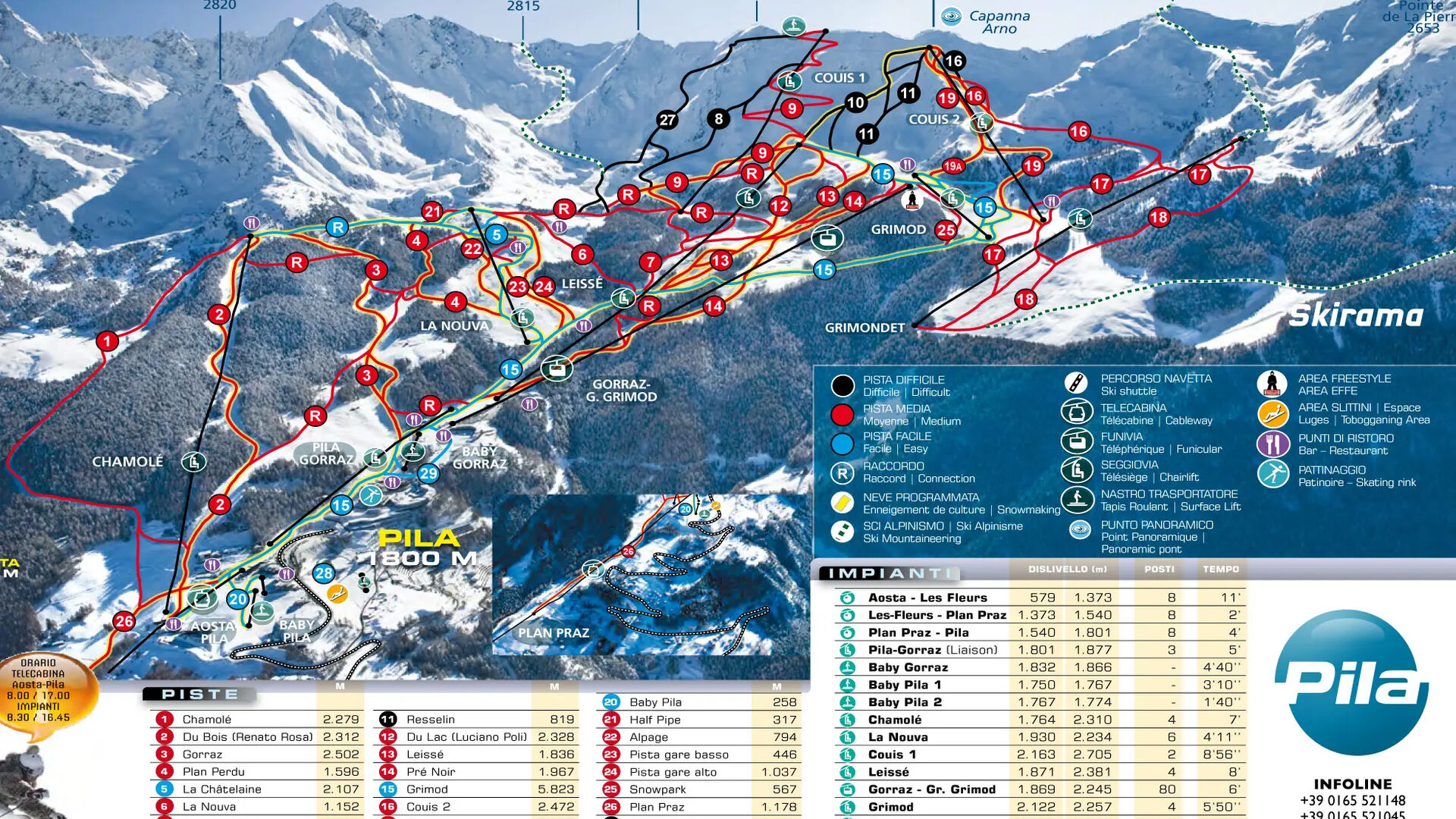 Lyžařské středisko Pila se nachází v údolí Aosta nad středověkým městem Aosta, které je hlavním městem tohoto regionu. Odtud vede lanovka do lyžařského střediska, která lyžaře během přibližně 15 minut dopraví na sjezdovky. Nahoře se nacházejí převážně středně obtížné sjezdovky a úchvatné panoramatické výhledy do všech směrů, od Mont Blancu až po Matterhorn a Monte Rosa.