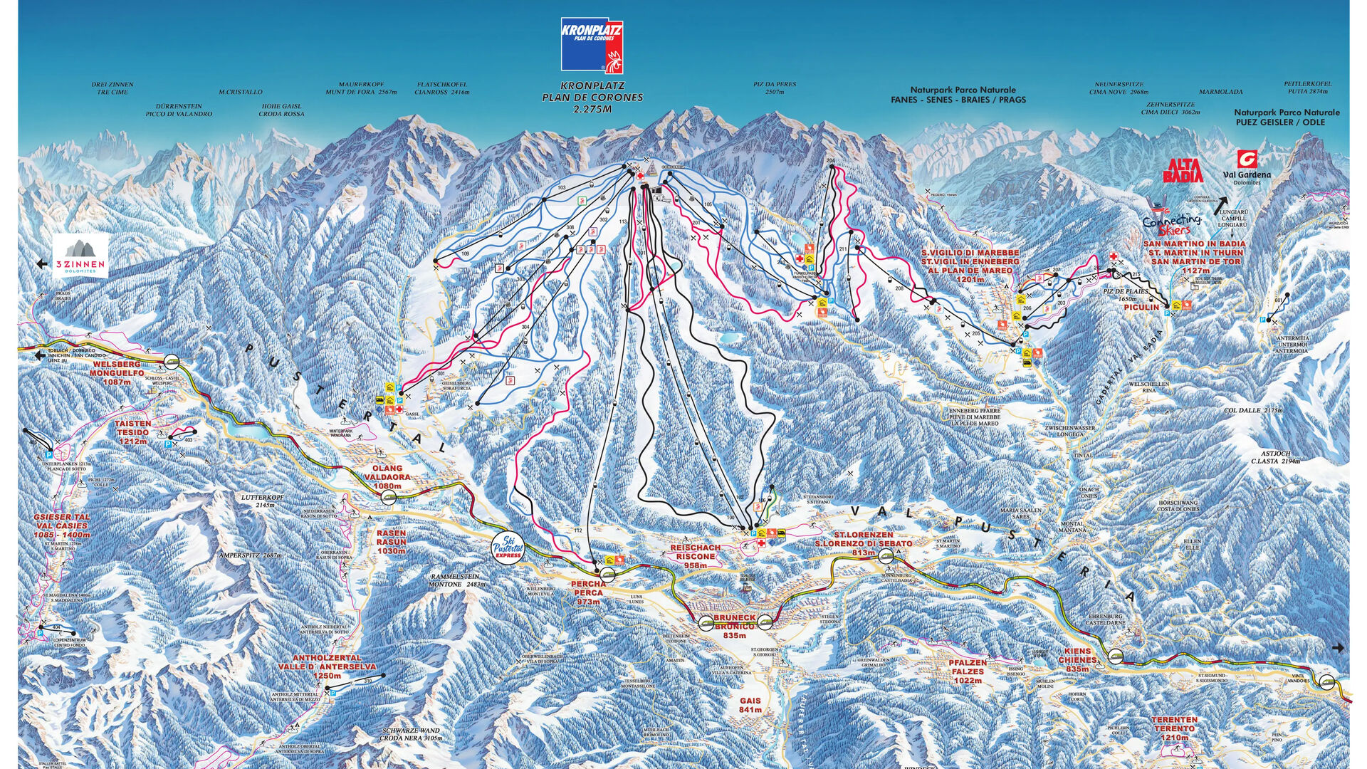 Kronplatz je nejoblíbenější lyžařské středisko v Jižním Tyrolsku a v roce 2012 bylo vyhlášeno nejlepším lyžařským střediskem v Itálii. 121 kilometrů sjezdovek pro všechny úrovně lyžařů, 31 nejmodernějších vleků, úchvatné běžecké trasy a útulné horské chaty – zde si můžete užít zimní dovolenou v té nejlepší podobě. Široké, mírné sjezdovky pro rodiny a začátečníky a rychlé sjezdy, které nabízejí spoustu zábavy – díky rozmanitosti si zde každý najde tu správnou sjezdovku.