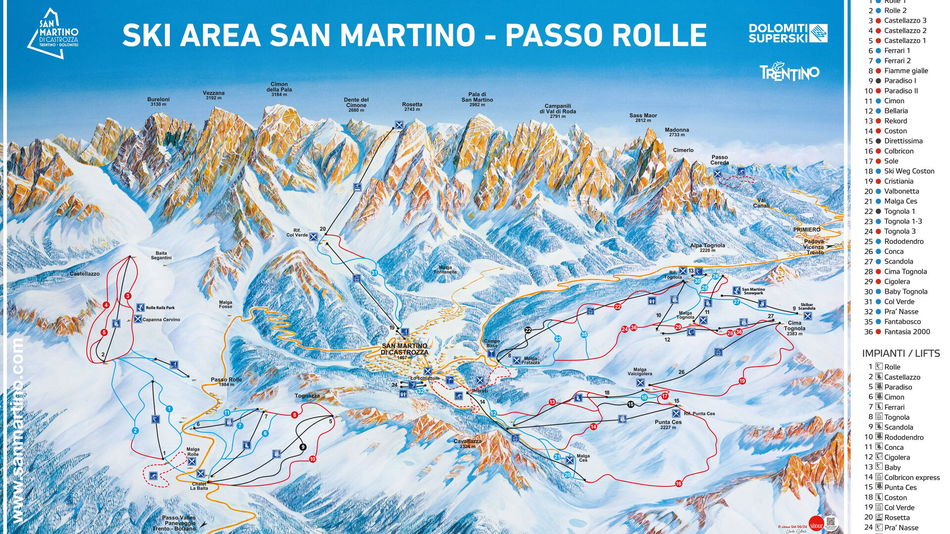 Lyžařské středisko San Martino di Castrozza - Passo Rolle se nachází uprostřed Dolomit a těší se z mírného klimatu s mnoha slunečnými dny. Díky nadmořské výšce téměř 2 000 metrů v oblasti Passo Rolle je zde často možné lyžovat již v listopadu, zatímco nižší sjezdovky jsou obvykle otevřeny od začátku prosince do Velikonoc.