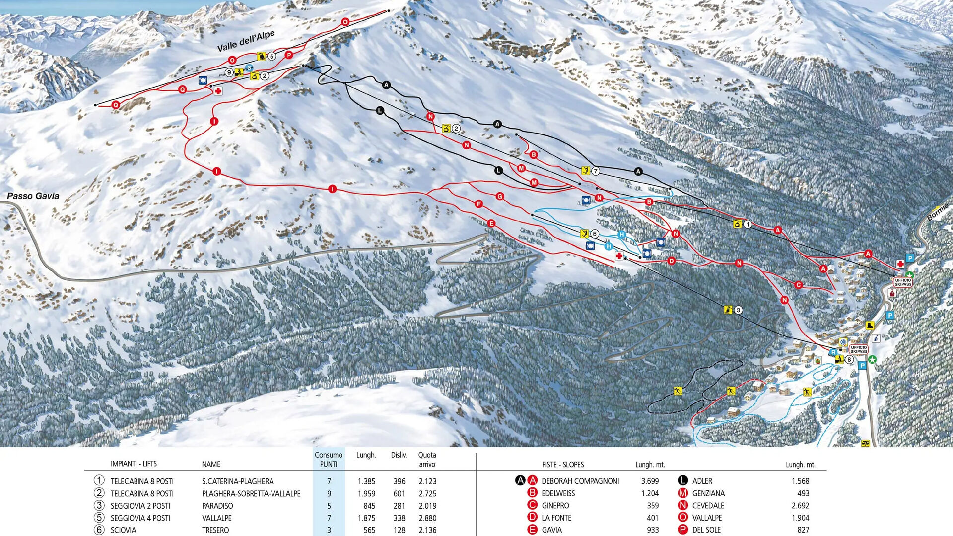 Zvláště známá a oblíbená je červeně-černá trať Deborah Compagnoni o délce 3,7 km. Na této sjezdovce se v roce 2005 konalo mistrovství světa v alpském lyžování. Pojmenována je po trojnásobné světové šampionce a olympijské vítězce Deborah Compagnoni, zdaleka nejúspěšnější italské lyžařce, která se narodila v Santa Caterině. Díky modernímu osvětlení je trať oblíbená i pro noční lyžování.