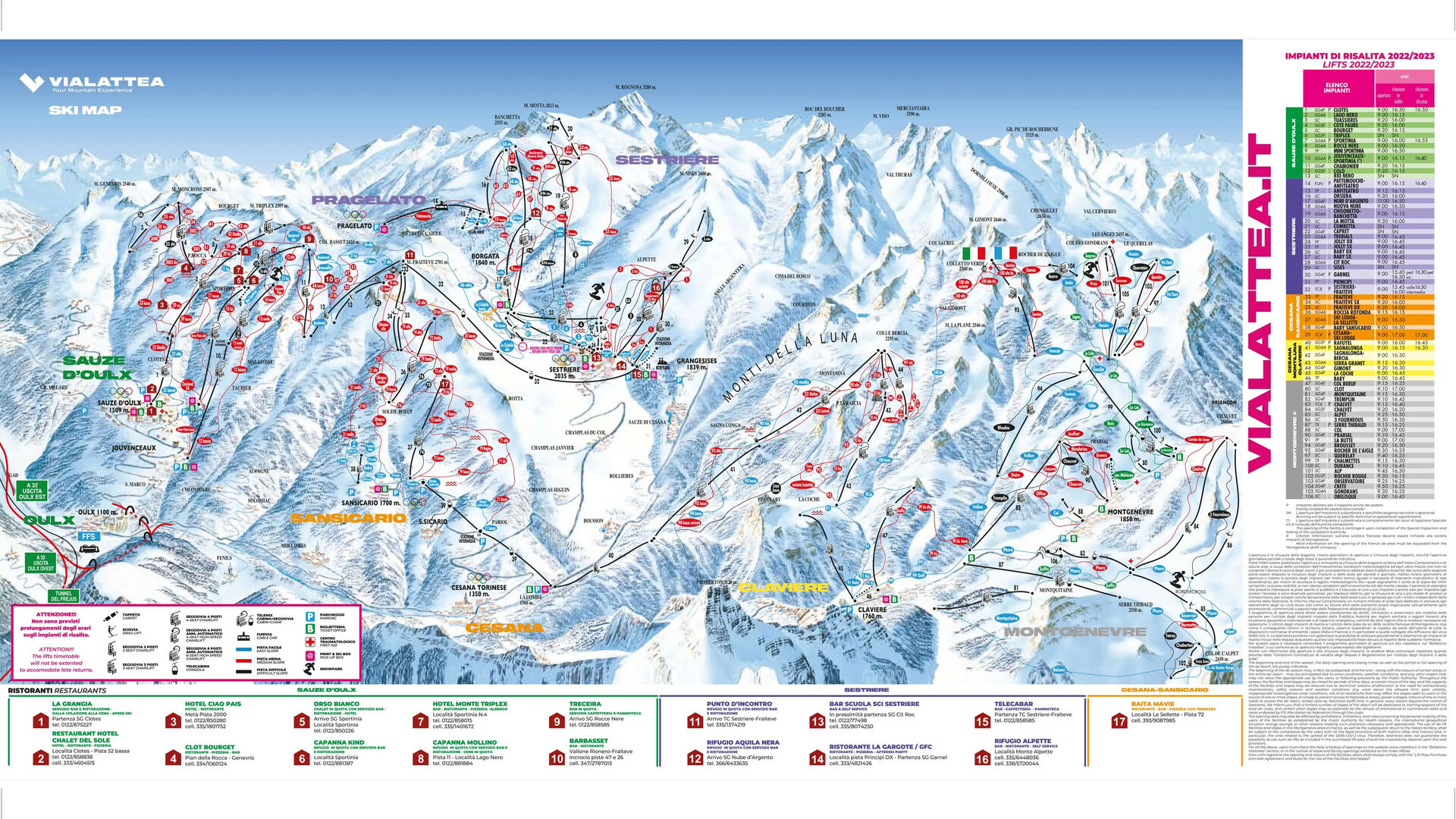 Sestrière se nachází v srdci lyžařského areálu Via Lattea, do kterého patří i oblasti Clavière, Sauze d'Oulx, Pragelato, Sansicaro, Cesana a francouzské Montgenèvre. Celkově nabízí Via Lattea 400 kilometrů sjezdovek a má pro každou úroveň lyžařů tu správnou trať.