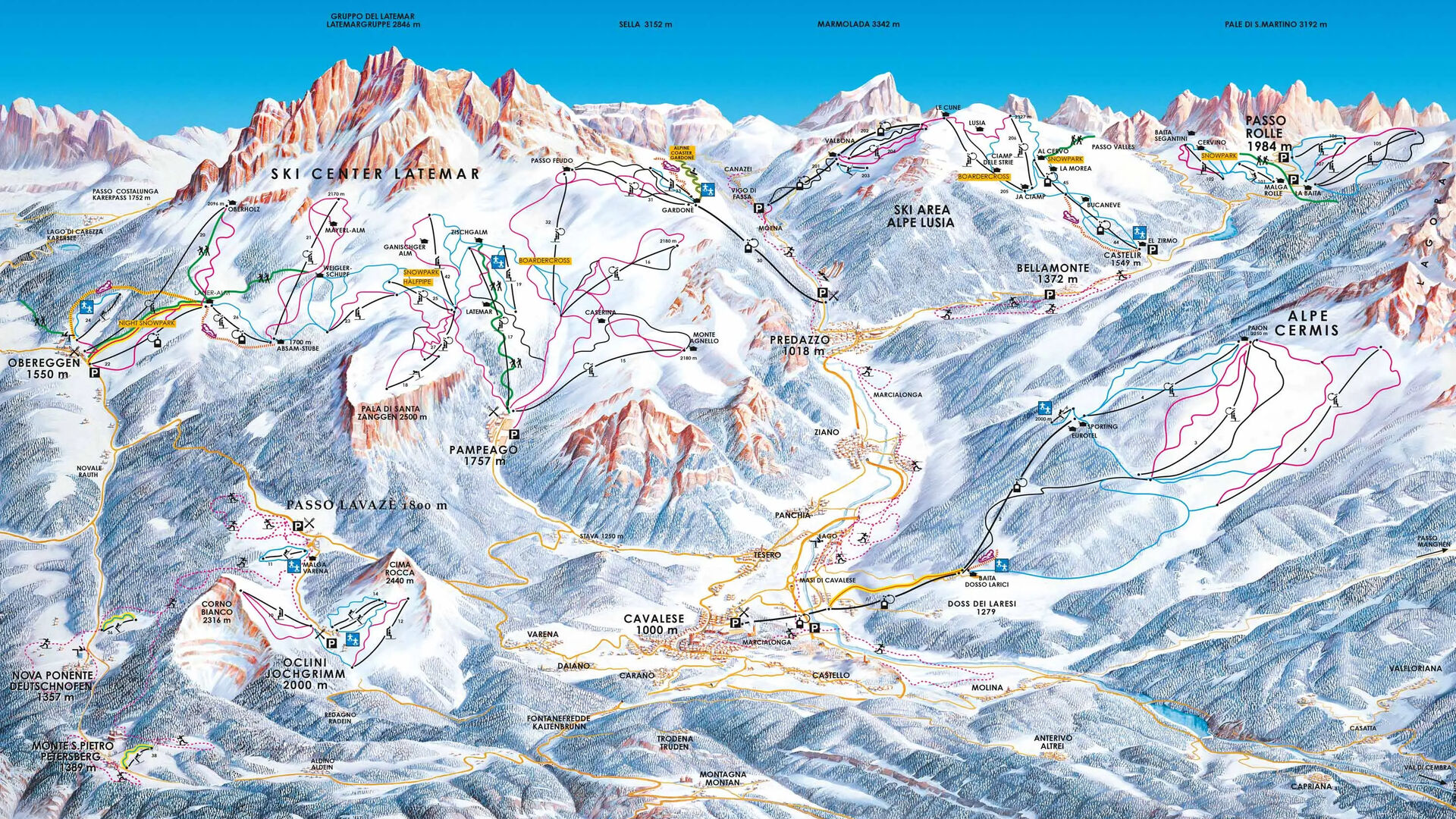 Lyžařská oblast Val di Fiemme se skládá z několika různých lyžařských areálů, které jsou částečně propojené, ale také existují jako samostatné oblasti. V údolí Val di Fiemme umožňuje skipas přístup do pěti různých lyžařských areálů.