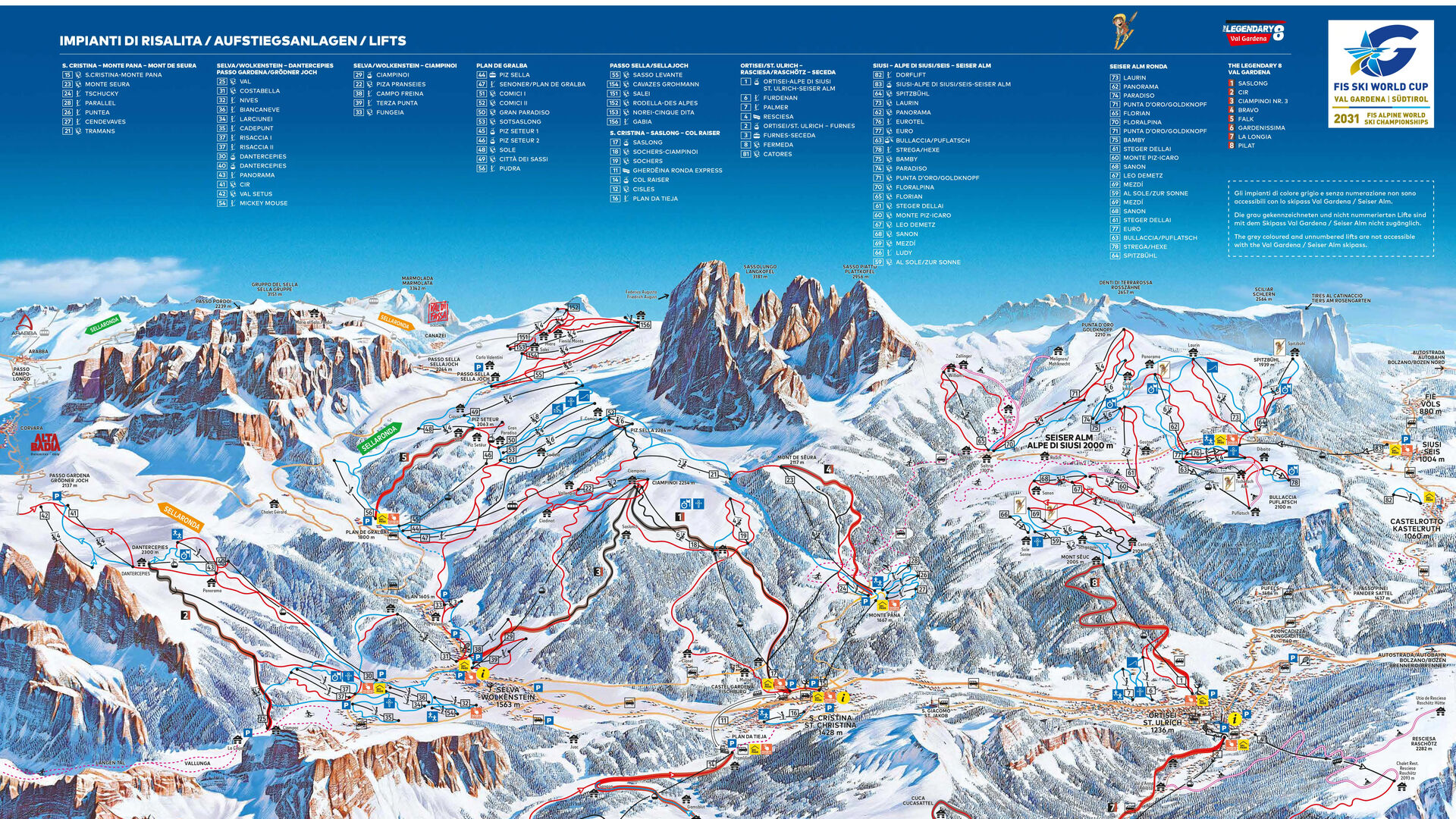 Ale to není všechno: Gröden – Val Gardena patří ke světově největšímu lyžařskému středisku Dolomiti Superski – to znamená 500 km propojených sjezdovek kolem pohoří Sella a celkem 1 200 km sjezdovek v dvanácti lyžařských oblastech. Gröden leží také na Sellarondě, což je lyžařská trasa kolem masivu Sella. Během Sellarondy se impozantní pohoří Sella obkrouží na lyžích během jediného dne: to znamená 26 km sjezdovek, čtyři údolí a tři provincie. Na tuto jedinečnou lyžařskou trasu byste si měli naplánovat zhruba šest hodin.