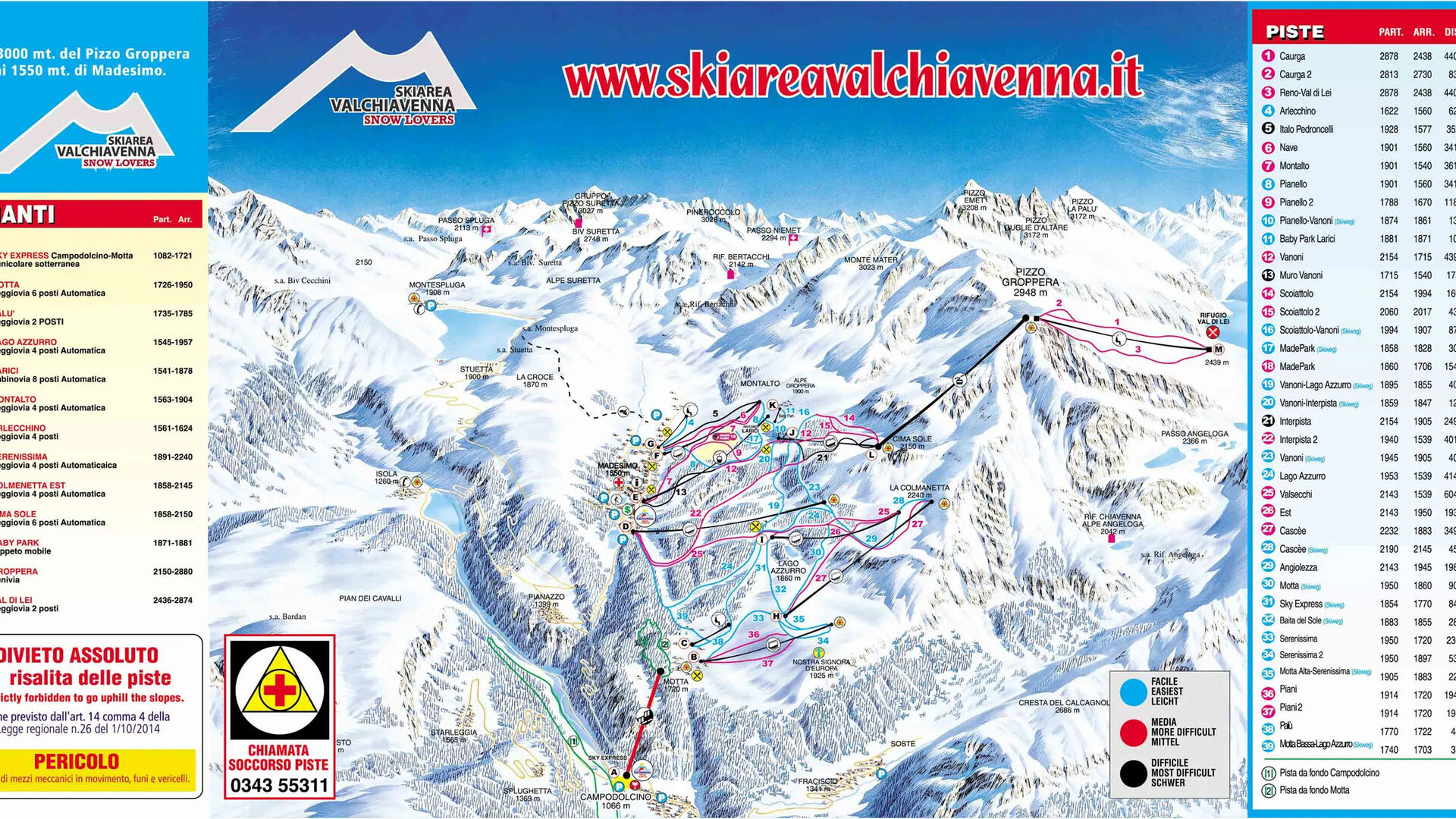Mezi 60 kilometry sjezdovek, které se nacházejí na 36 sjezdovkách různých obtížností, není problém najít ideální sjezd, který odpovídá vašim schopnostem. Zatímco začátečníci preferují snadné sjezdovky, zkušení lyžaři se pouštějí do nejznámější sjezdovky v okolí: Canalone. Tato úzká a neupravená sjezdovka vede od vrcholu Pizzo Groppera dolů do lyžařského areálu.
