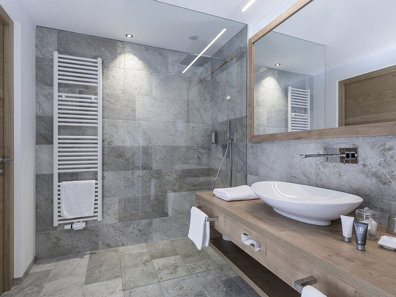 Deluxe 2/3/4 - 36 m² pokoj s manželskou postelí a případně rozkládacím gaučem pro 1 až 2 osoby, sociální zařízení, balkon s panoramatickým výhledem na hory