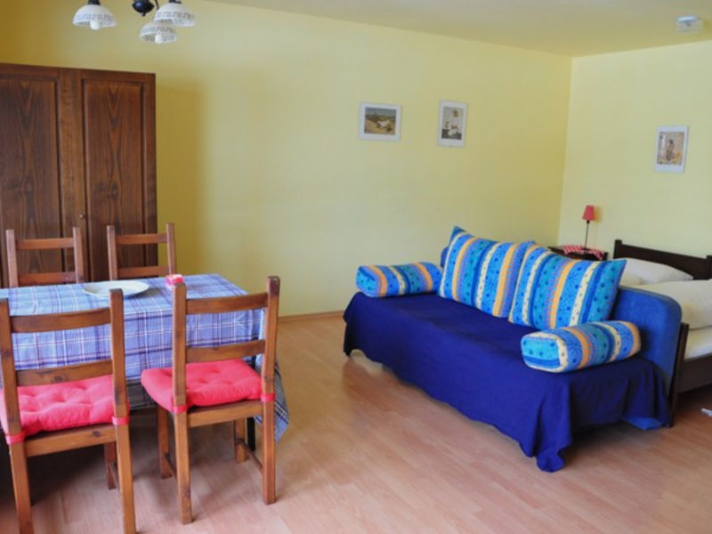 Apartmán č. 5 pro 2-3 osoby (37 m2, ozn. A/3) – v 1. patře, 1 místnost s dvoulůžkem a gaučem, kuchyňský kout, velký balkon.