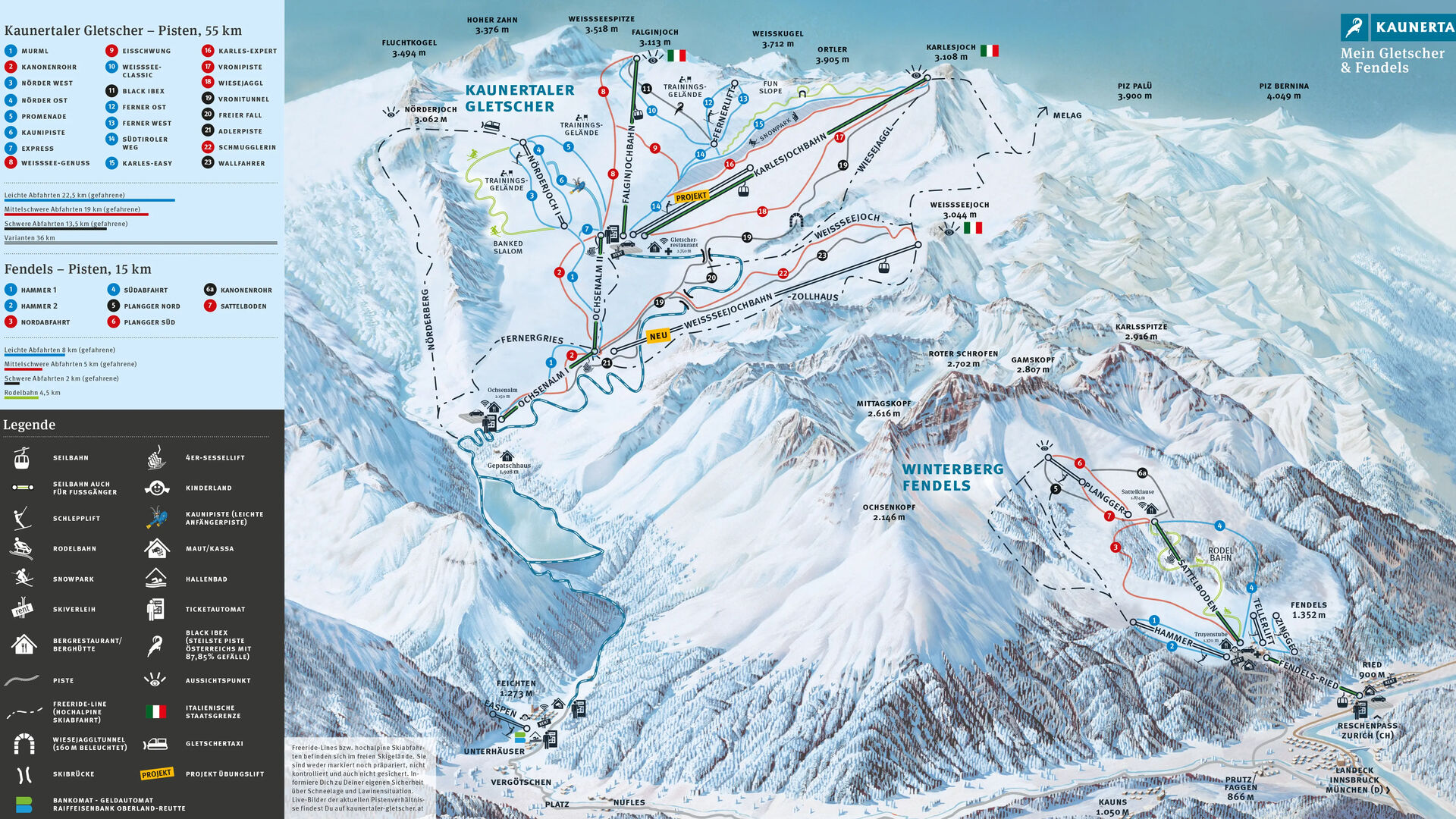 Na ledovci Kaunertaler, který rovněž provozují lanovky Kaunertaler Gletscherbahnen, je k dispozici dalších 55 kilometrů sjezdovek, kde panují dobré podmínky i na jaře a již na podzim. Skipas Kaunertaler Gletscher platí ve Fendels a na ledovci Kaunertaler. Při koupi online vstupenky jsou v obou lyžařských areálech odměněni předplatitelé slevou až 30 %.
