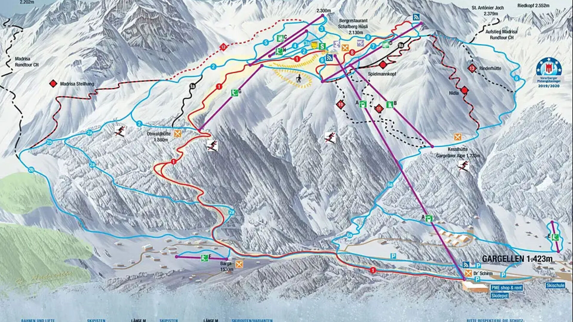 Lyžařské středisko Gargellen je výchozím bodem pro okružní túru Madrisa z Rakouska do Švýcarska a zpět. Trasa vede přes Täli, sedlo St. Antönier Joch, sedlo Schlappiner Joch a údolí Valzifenz Tal. Celkem by se mělo při dobrém počasí naplánovat šest až sedm hodin. Za tuto dobu budete odměněni hlubokosněžnými svahy a dechberoucími výhledy na Rätikon a švýcarskou horskou krajinu.