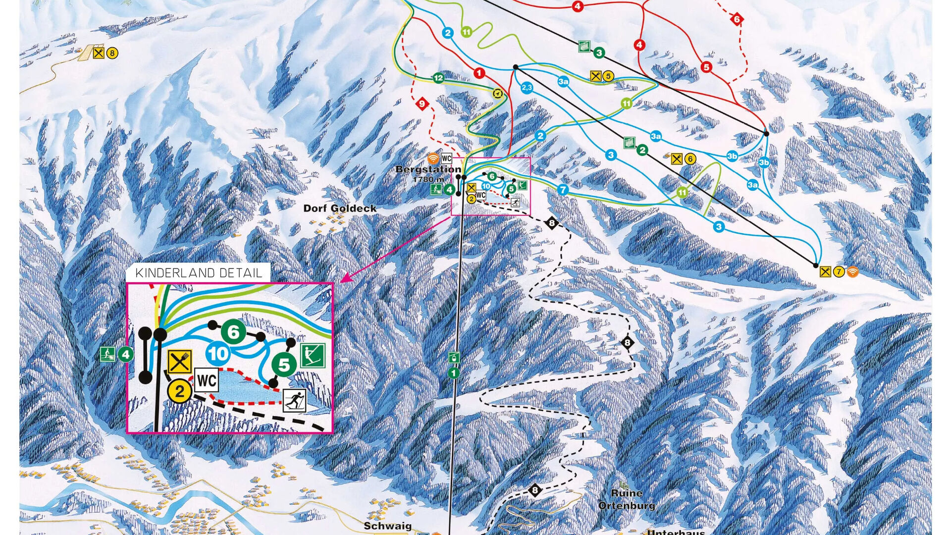 Ten, kdo důkladně prozkoumal sjezdovky, se vydá na jednu z nejdelších černých sjezdovek v Alpách. Na 8,5 km překoná převýšení 1 600 metrů – to je skutečně nezapomenutelný zážitek! Nepřipravená lyžařská trasa končí u dolní stanice lanovky Goldeck v nadmořské výšce 550 metrů.