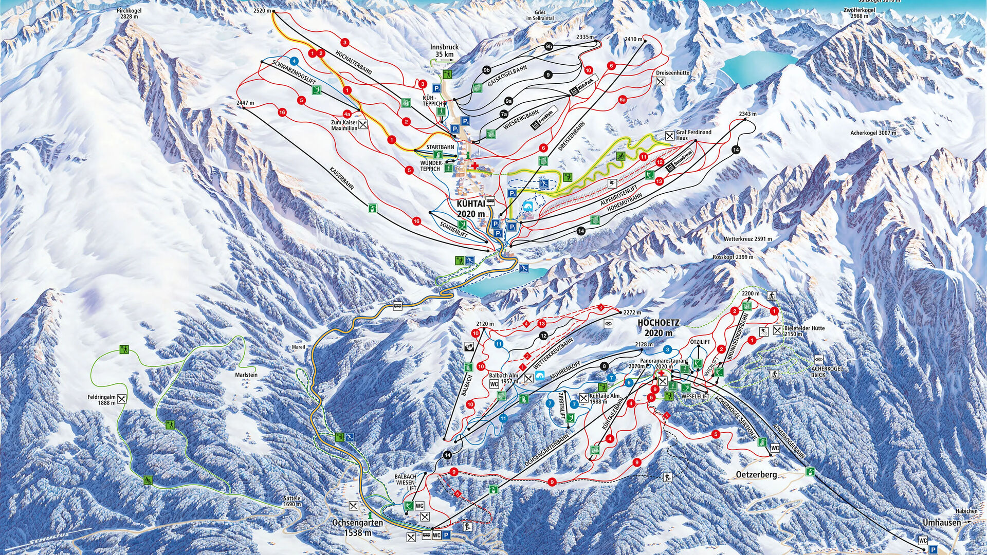 Skiareál je dosažitelný z Umhausenu osmioranovou lanovkou Acherkogel nebo z Ochsengartenu lanovkou stejného jména. Kdo se chce oddat rychlostnímu šílenství, sjet si trvalou závodní trať u sjezdovky Brunnenkopf. Ve funparku Hochoetz si přijdou na své freestylové lyžaři a snowboardisté. Snowpark se nachází v oblasti Balbach u dvouoranové sedačkové lanovky a čeká na vás s mnoha překážkami různých obtížností. Mezi ně patří zábradlí, boxy, skokanské můstky, vlna a barel. Park je denně udržován týmem pistových strojů.