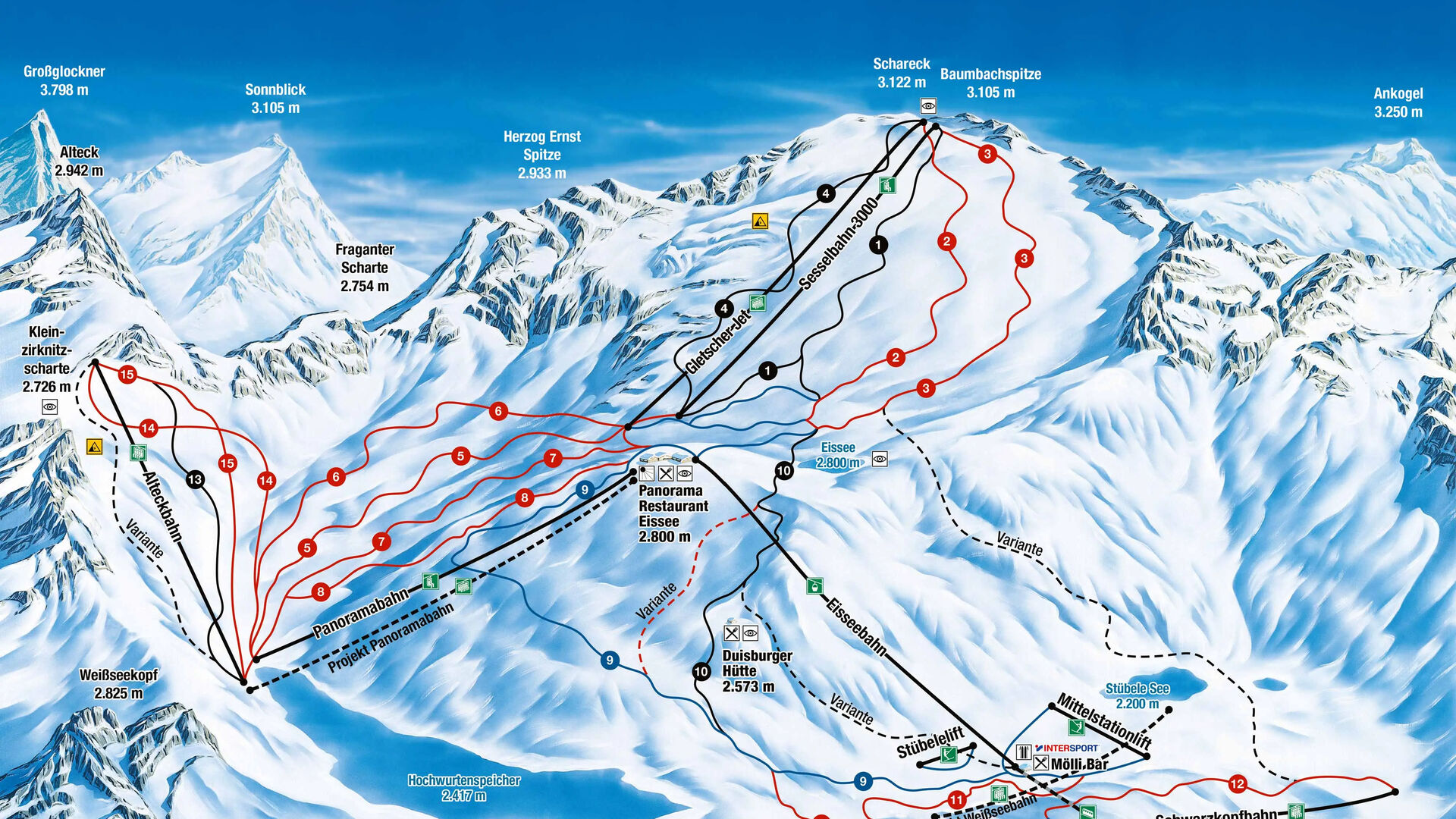 Středobodem lyžařského areálu na Mölltaler Gletscher je Panorama Restaurant Eissee v nadmořské výšce 2 800 metrů. Odtud lze volit různé varianty sjezdovek k lanovce Klühspies-Sessellift, směrem na Alteck a Kleinzirknitzscharte nebo k Gletscherjet. Ten směřuje na Schareck o výšce 3 122 metrů, nejvyšší bod na Mölli a skvělý vyhlídkový bod. Dobrá věc je, že z každé horské stanice máte na výběr několik sjezdovek různých obtížností. Mölltaler Gletscher je mimochodem velmi oblíbený i u lyžařských týmů, které zde trénují denně na podzim a v časné zimě