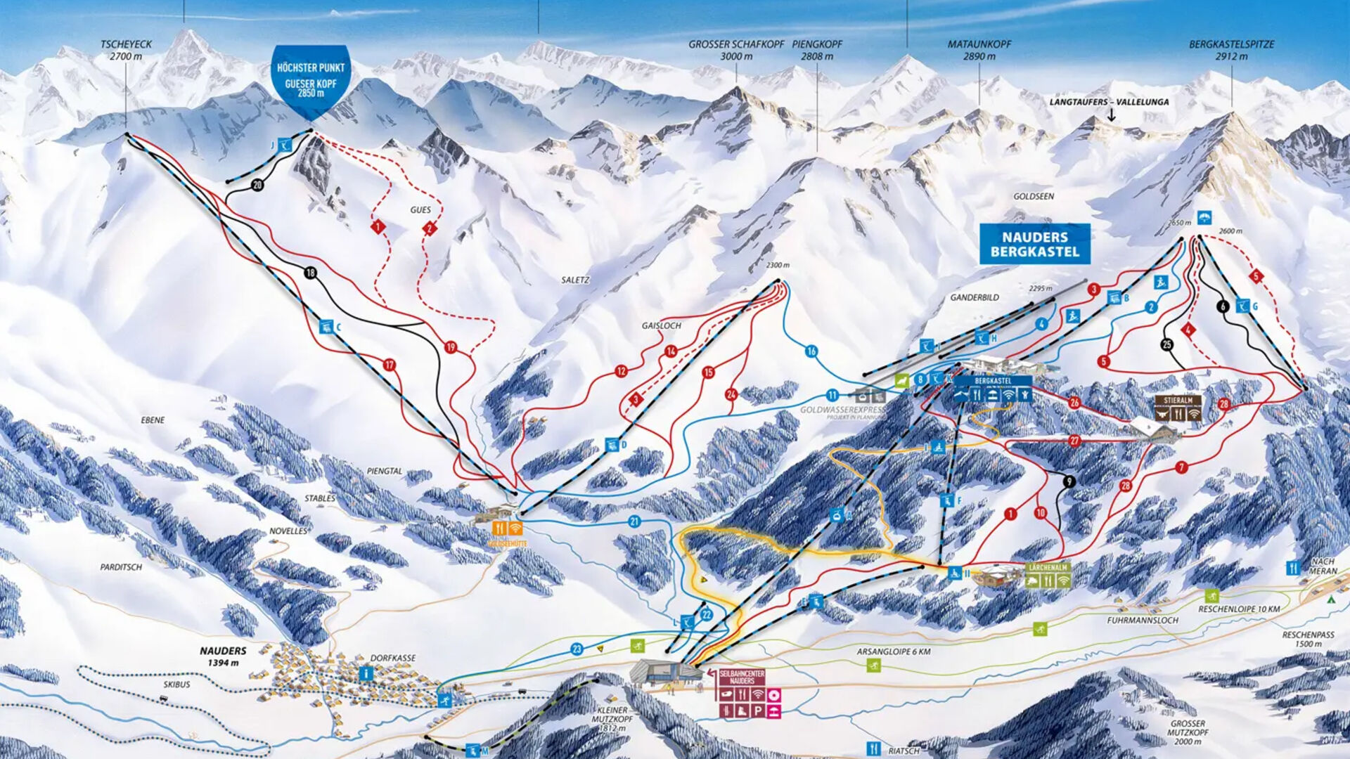 V Nauders najdete celkem 75 kilometrů sjezdovek, převážně snadných a středně obtížných svahů. Díky četným investicím v posledních letech byly mnohé sjezdovky rozšířeny. Zvláště na Gaislochu se šířkou sjezdovek 85 metrů se proto cítí carvingoví lyžaři velmi dobře. Začátečníci a děti si procvičují své první oblouky na cvičném areálu u dolní stanice Bergkastel. Zkušení lyžaři si testují své dovednosti na devítikilometrové okruhové trati, na prašanových svazích a na boulích.