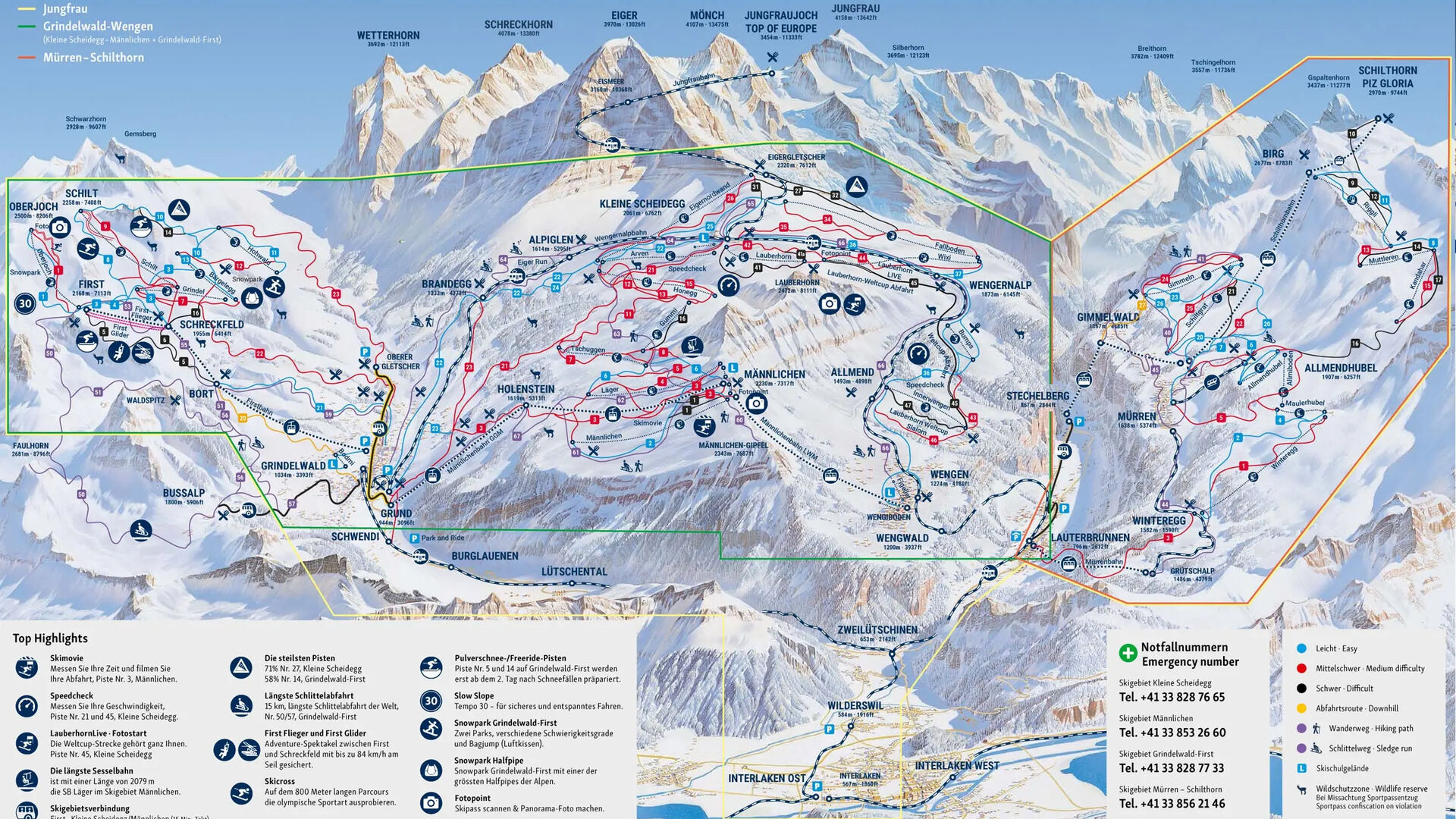 Mezi nejkrásnějšími vrcholky světa, které se tyčí do výšky 4 000 metrů, se nacházejí tři lyžařské areály: Grindelwald First, Mürren-Schilthorn a Grindelwald-Wengen, které dohromady tvoří lyžařskou oblast Jungfrau Ski Region.