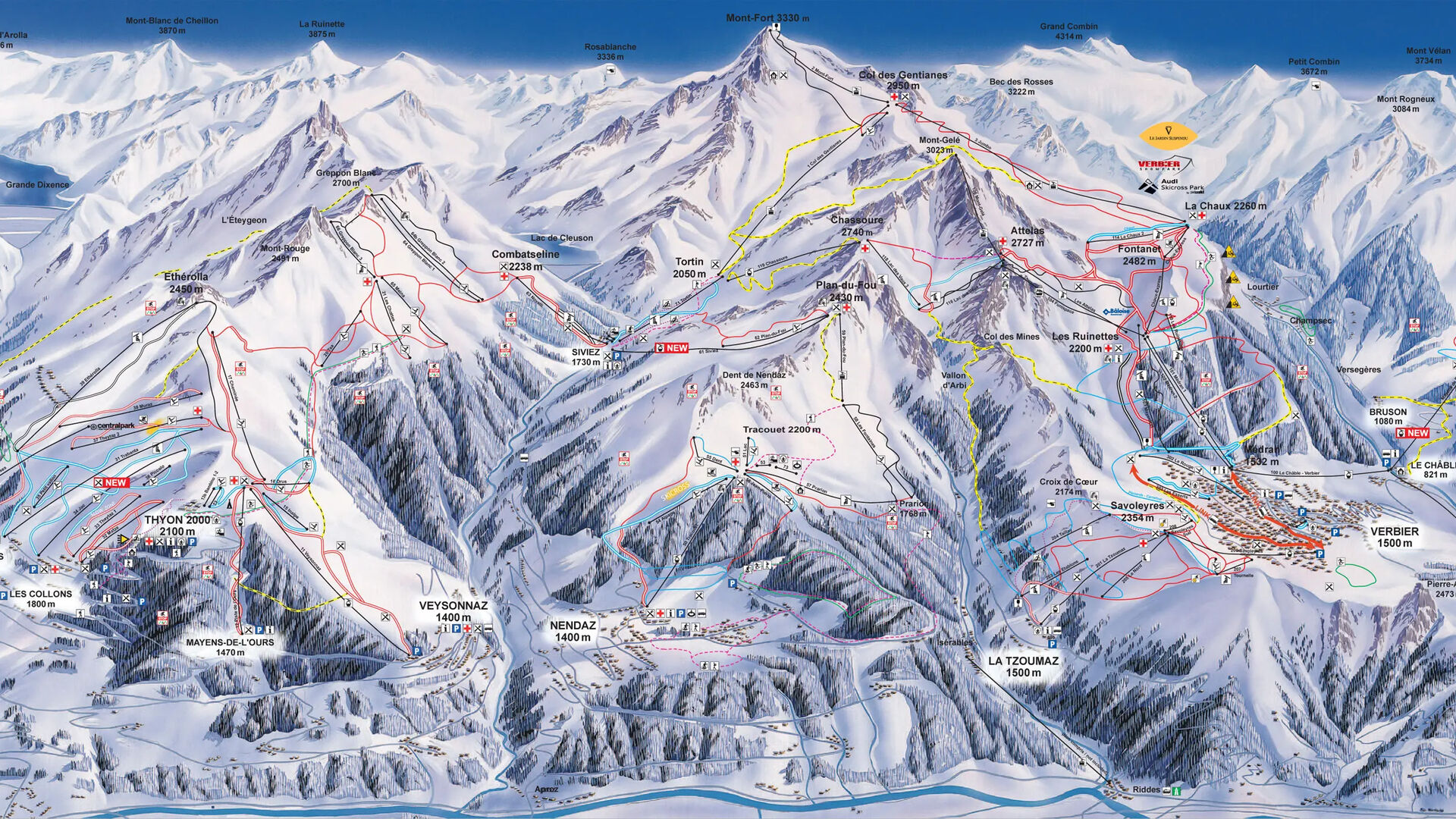 Lyžařské středisko Verbier nabízí přibližně 200 km rozmanitých sjezdovek a 33 vleků. Protože je toto středisko přímo propojeno s Nendaz, La Tzoumaz, Veysonnaz, Thyon, Les Collons, Les Masses a Bruson, můžete využít dokonce 412 km sjezdovek a 78 vleků – což je více než dost pro delší lyžařskou dovolenou.