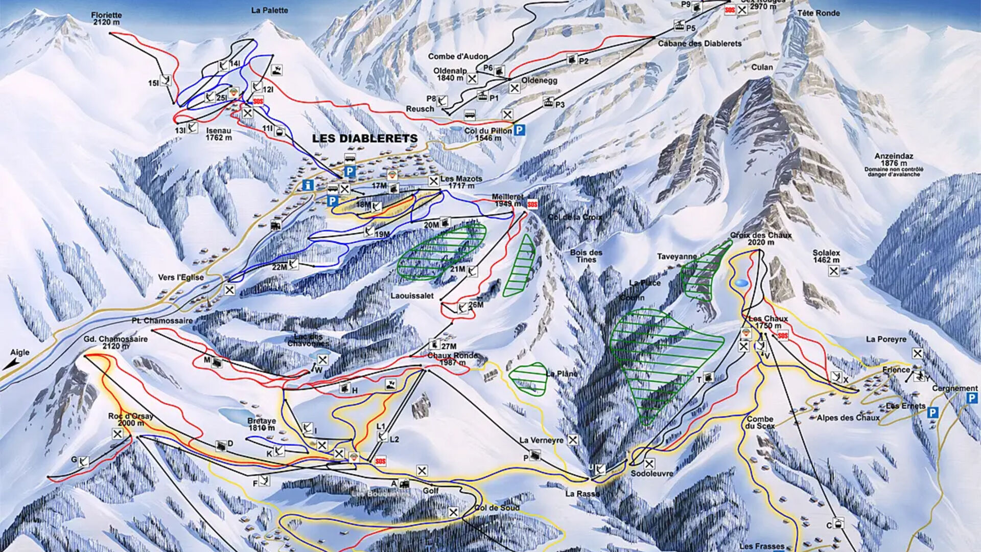 V zimním středisku Les Diablerets čekají na návštěvníky hned tři lyžařské areály. Isenau, který se nachází v ideální jižní svahové poloze, si nejčastěji vybírají rodiny a začínající lyžaři. Le Meilleret je náročnější a je propojen s lyžařskou sítí Villars-Gryon. V oblasti Glacier 3000 se nachází nejvyšší bod a nejvýše položené sjezdovky v kantonu Vaud. Od Col du Pillon dopravují lanovky lyžaře na vrcholovou stanici. Na zkušené lyžaře zde čeká jedna z nejobtížnějších sjezdovek v regionu, Combe d'Audon.