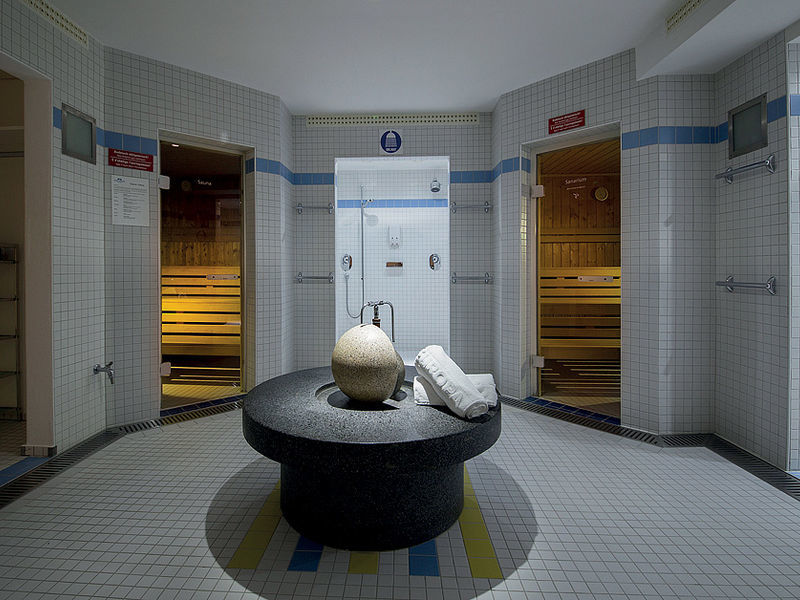 bazén 130 m², vířivka, sauna, pára, bio sauna, zážitková sprcha, relaxační koutek v zimní zahradě, masáže*, posilovna, stolní tenis, biliár; vstup do celého wellness včetně bazénu pro děti pouze v doprovodu dospělých osob